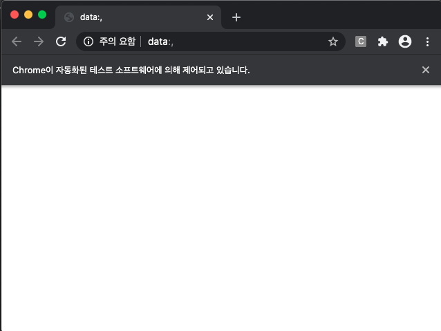 driver = webdriver.Chrome(chrome_driver_dir)위의 코드를 실행하면 아래와 같은 크롬의 빈 창이 켜집니다. 위에 Chrome이 자동화된 테스트 소프트웨어에 의해 제어되고 있다고 설명이 뜨네요.
