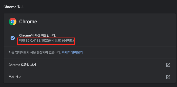 여기서 빨간 네모 박스로 쳐진 곳을 확인하여 자신이 설치한 크롬의 버전을 확인합니다.