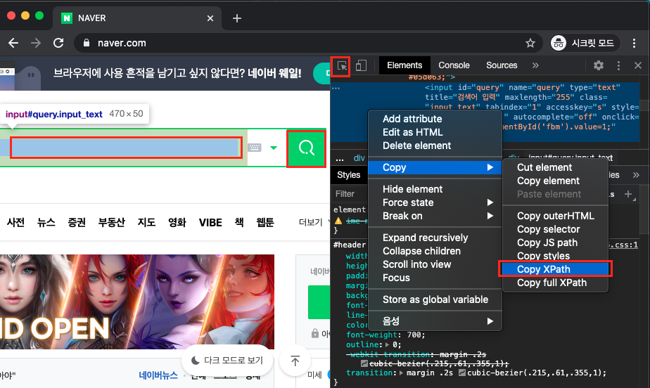 화면 가운데에 아이콘을 누르고, 입력이나 클릭을 원하는 위치에서 마우스 클릭해줍니다. 그러면 오른쪽 창에서 해당 부분을 가리키는 html로 이동하게 되는데요, 그 부분에서 마우스 오른쪽 버튼을 클릭하여, Copy - Copy XPath 를 순차적으로 눌러줍니다.