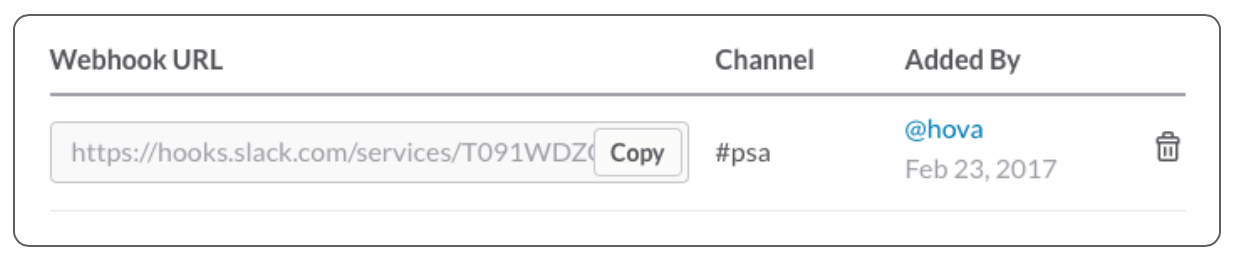 그럼 페이지 최하단에 Add New Webhook to Workspace버튼을 클릭하여 메시지를 보낼 workspace를 선택한다. 그럼 아래와 같은 Webhook URL 링크가 추가된다. 이 링크로 post 요청을하면 메시지가 전송된다.