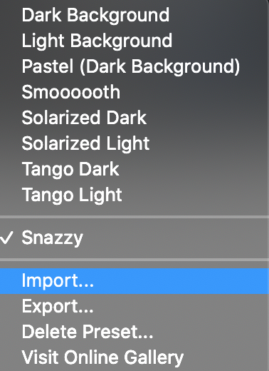 https://iterm2colorschemes.com 이 링크에서 원하는 테마 이름 위에서 마우스 오른쪽 버튼을 클릭하여 링크된 파일 다운로드 버튼을 클릭하여 다운받는다. 다운 받은 위치를 가서 확장자명 .txt를 지운다. (ex. 3024 Night.itemcolors.txt → 3024 Night.itemcolors, 필자는 snazzy)