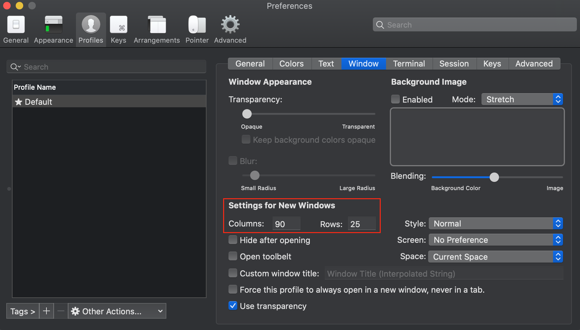 아래와 같이 Profiles - WIndow 탭에 들어가 원하는 크기의 columns, rows를 수정하여 새 창의 터미널을 켰을 때 크기를 변경할 수 있습니다.