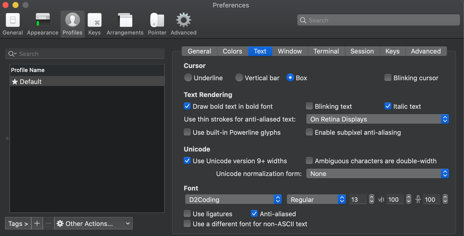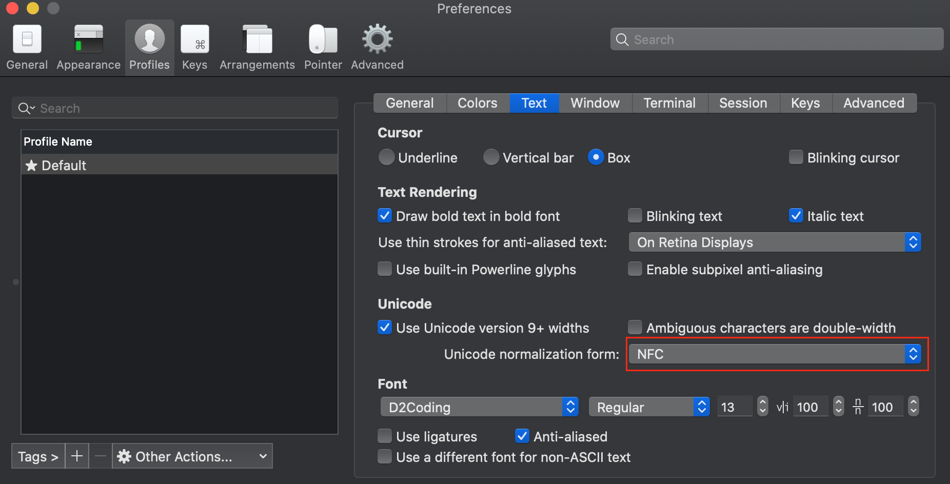 이번엔 환경설정에서 Profiles - Text 탭에 들어가서 아래 Font를 위의 다운받은 폰트로 변경해준다.