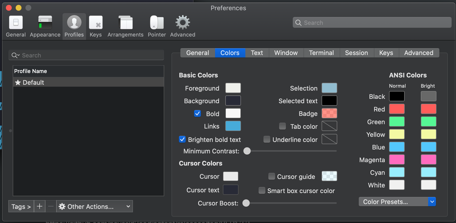 iTerm2 앱에서 cmd+, 를 눌러 환경설정을 열고, Profiles - Colors 탭을 선택한다.