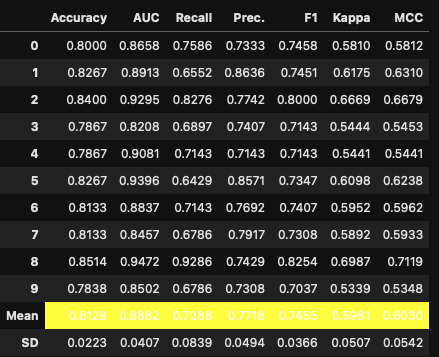 잘 안보이지만 Accuracy의 Mean값이 0.8169로 위의 tuned_top5의 결과(0.8128)보다 값이 아주 조금 좋아졌습니다.