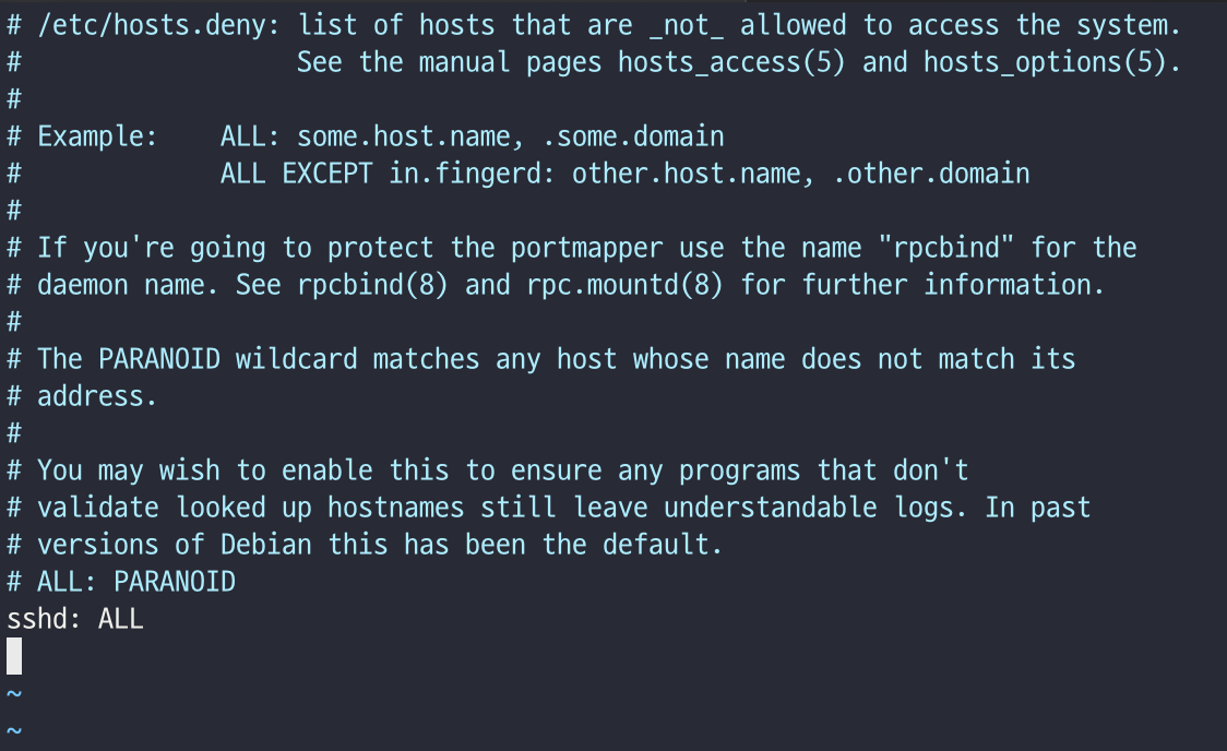 위처럼 sshd: ALL을 작성하면 hosts.allow 에서 입력한 허가된 IP를 제외한 모든 접속은 차단된다.