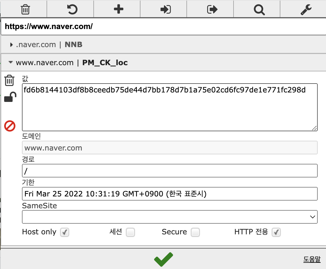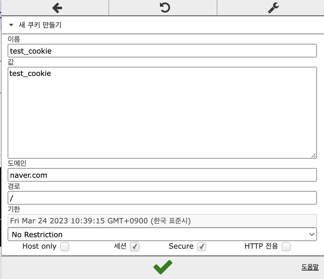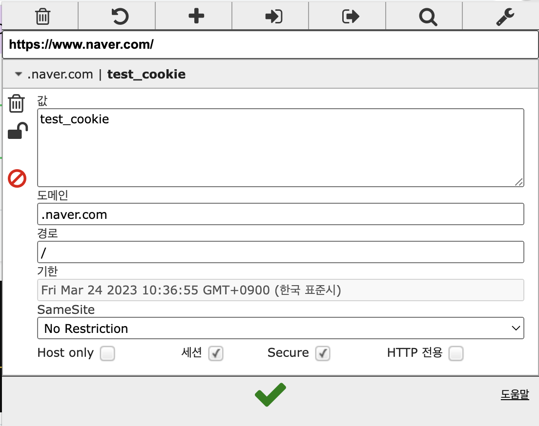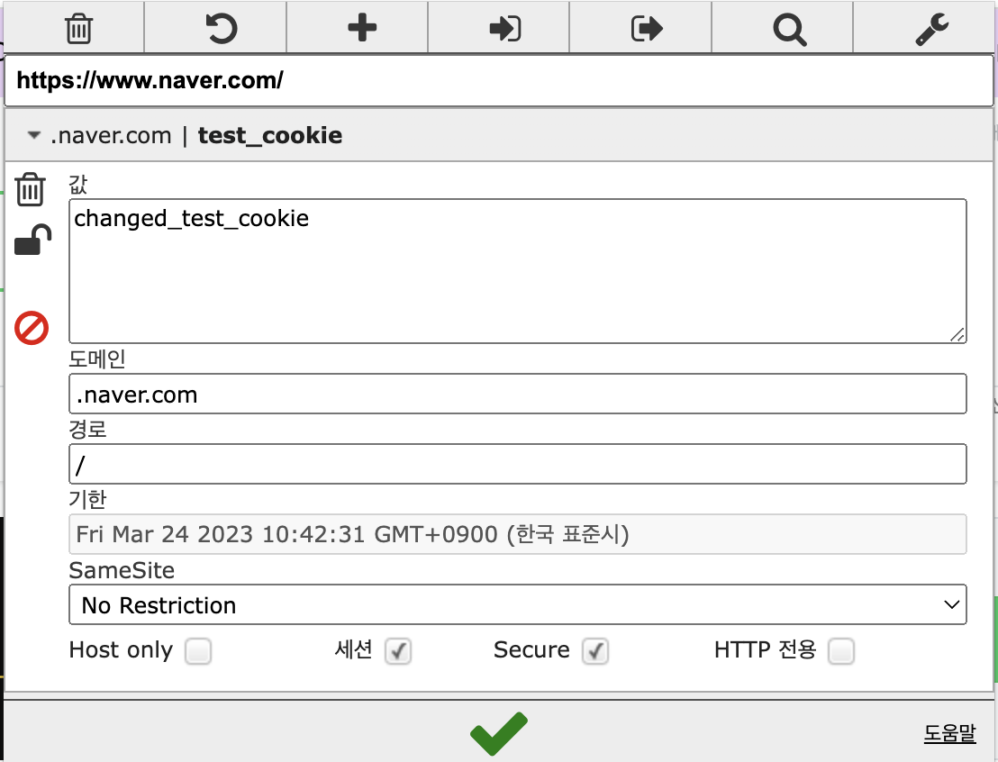위 화면에서 기존에 있는 쿠키의 값을 수정해서 아래 초록색 체크 버튼을 누르면 쿠키의 값이 수정된다.