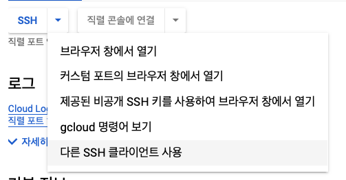생성된 인스턴스 페이지를 확인하시면 다른 SSH 클라이언트 사용 메뉴가 있습니다.