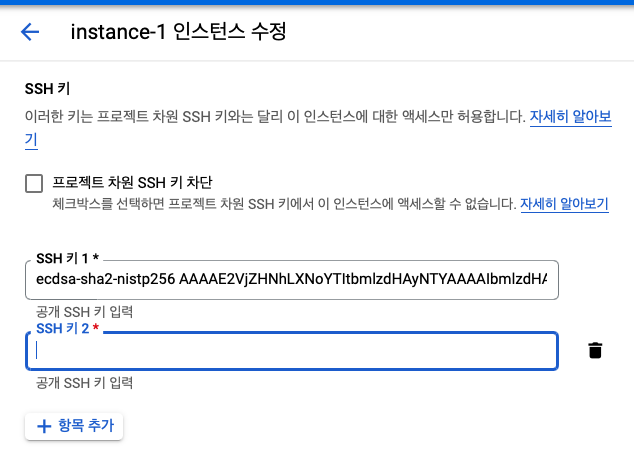 항목추가 버튼을 눌러 SSH키 2란에 위에서 복사한 Public Key를 입력합니다.