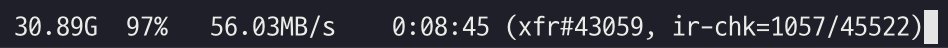 --info=progress2: 파일 단위가 아닌 전체 진행도를 한번에 출력한다. 이게 없으면 작은 복사하는 하위 파일들의 리스트가 모두 출력 되기 때문에 보기 불편하다.