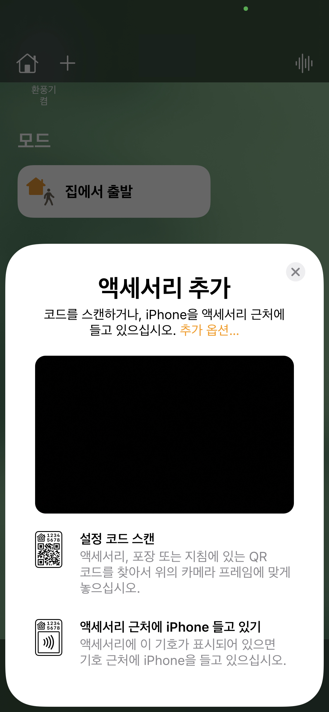 아이폰에서 홈 앱을 켜고 액세서리 추가를 누르고 위의 QR 코드를 인식해준 후에 8자리 숫자코드를 입력해주면 홈브릿지 등록이 완료된다.