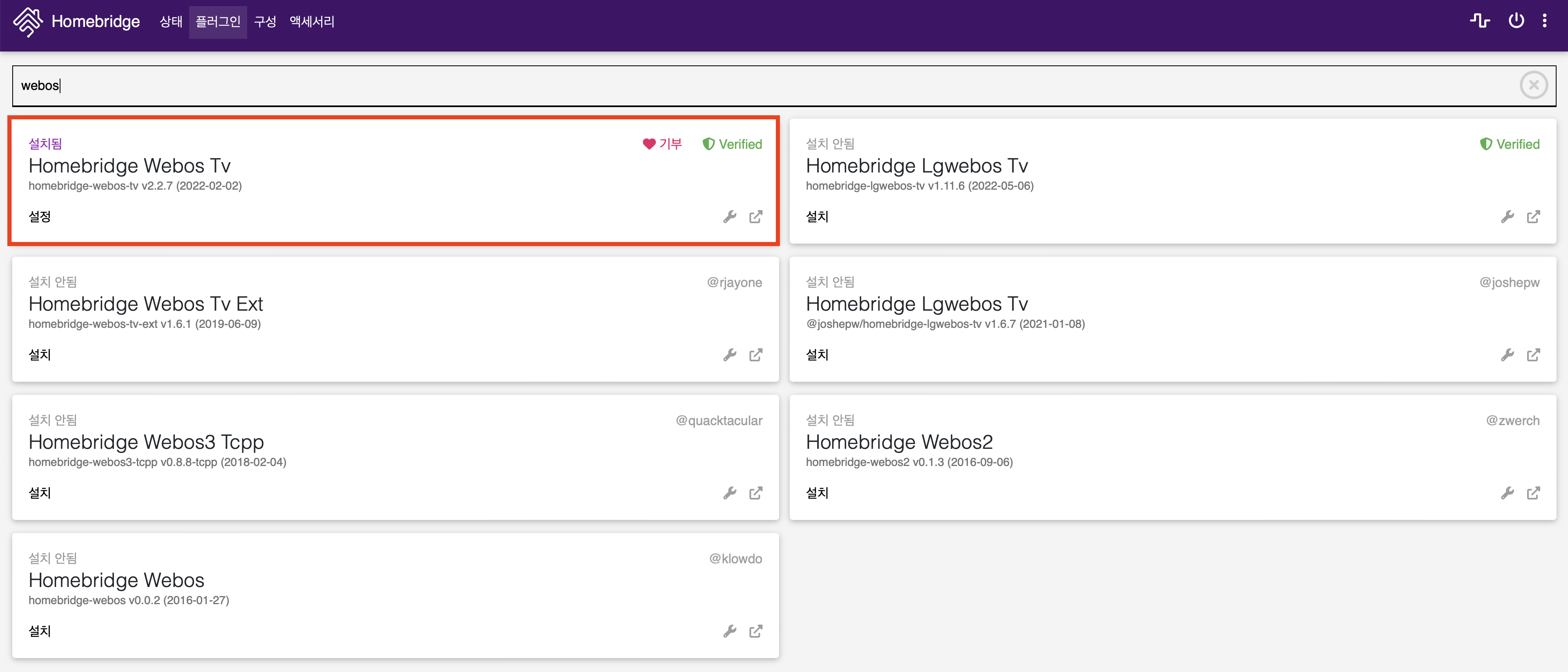 설치할 플러그인 검색에 원하는 기기를 검색해 본다. 예시로 LGtv의 경우에는 webos를 검색해서 설치하면 된다.