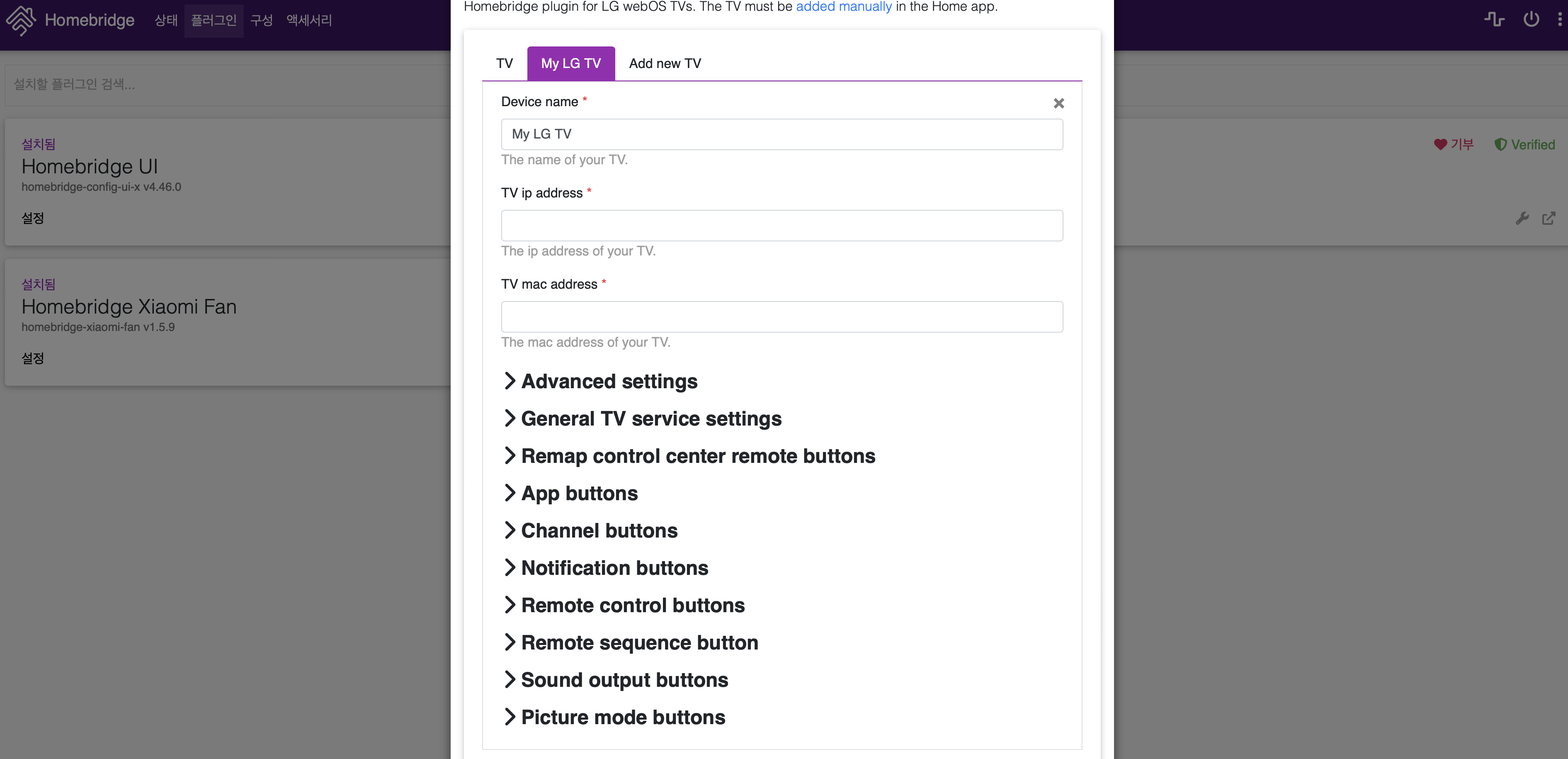 각 플러그인 아래에 설정 버튼을 클릭하면 기기를 등록할 수 있는 창이 뜬다. 본인의 TV의 IP, MAC주소를 확인해서 기입해주고 옵션 등을 확인한 후에 등록 버튼을 누른다.