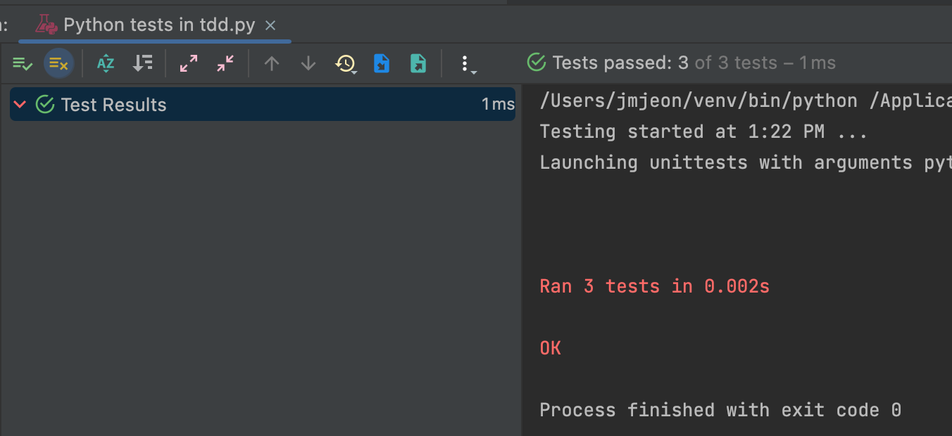 unittest.main()위 코드를 실행하여 에러가 없다면 아래와 같이 OK가 출력된다.