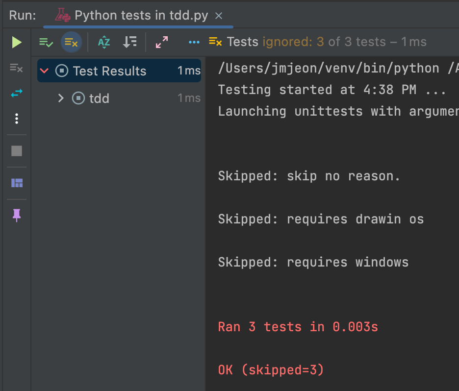 unittest.main()해당 테스트는 macOS(darwin)에서 진행했으므로 test2는 condition이 참이여서 skip되었고, test3는 win으로 시작하지 않기 때문에 skip되었다.