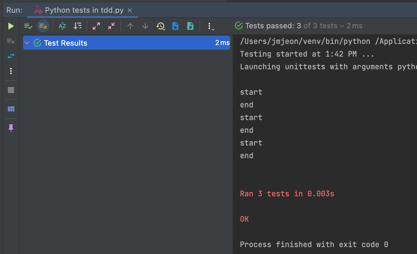 unittest.main()위의 코드를 실행하면 각각의 세가지 메소드를 테스트 하기 전에 start를 출력하고 테스트 후에 end를 출력한다.