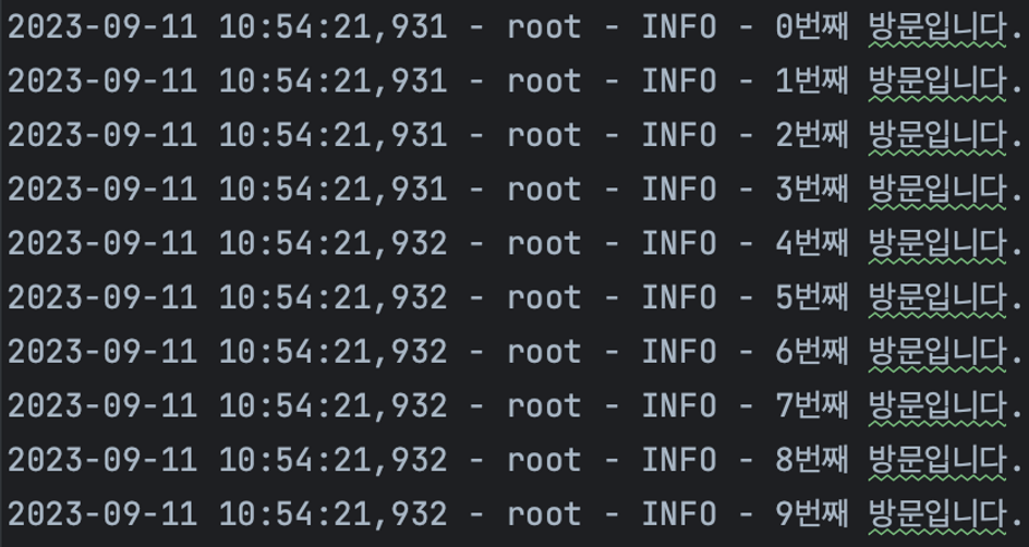 logger.info(f'{i}번째 방문입니다.')- 우선 첫 번째 줄처럼 loggin.getLogger()를 통해 logger를 생성해 줍니다.