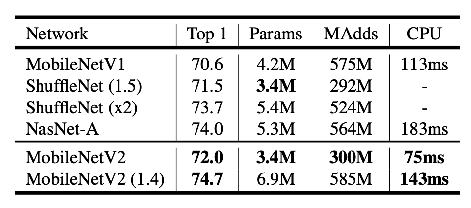 아래 표와 같이 MobileNetV2는 Params와 MAdds, 연산속도를 획기적으로 줄이면서, 기존의 MobileNet, ShuffleNet보다 더 좋은 성능을 보여줍니다. 이 뿐만 아니라 detection, segmentation에서도 적은 파라미터량으로 우수한 성능을 보입니다.