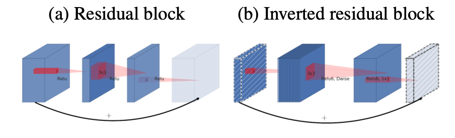(b)는 (a)와 다르게 block안에서의 channel이 더 크고 밖에서는 축소하는 형식입니다. 그래서 Inverted residual block이라는 이름이 붙은 것 같습니다.
