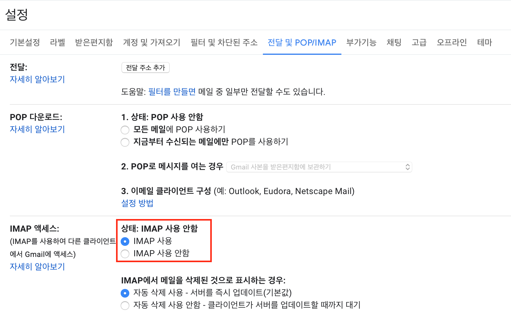 설정의 상단 탭 중에 '전달 및 POP/IMAP' 설정으로 들어갑니다.